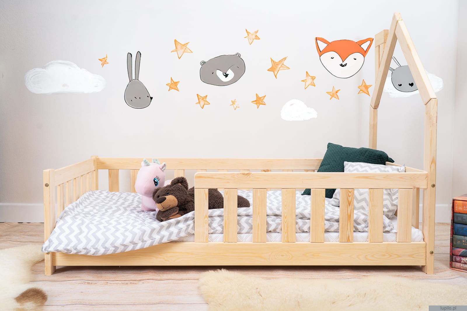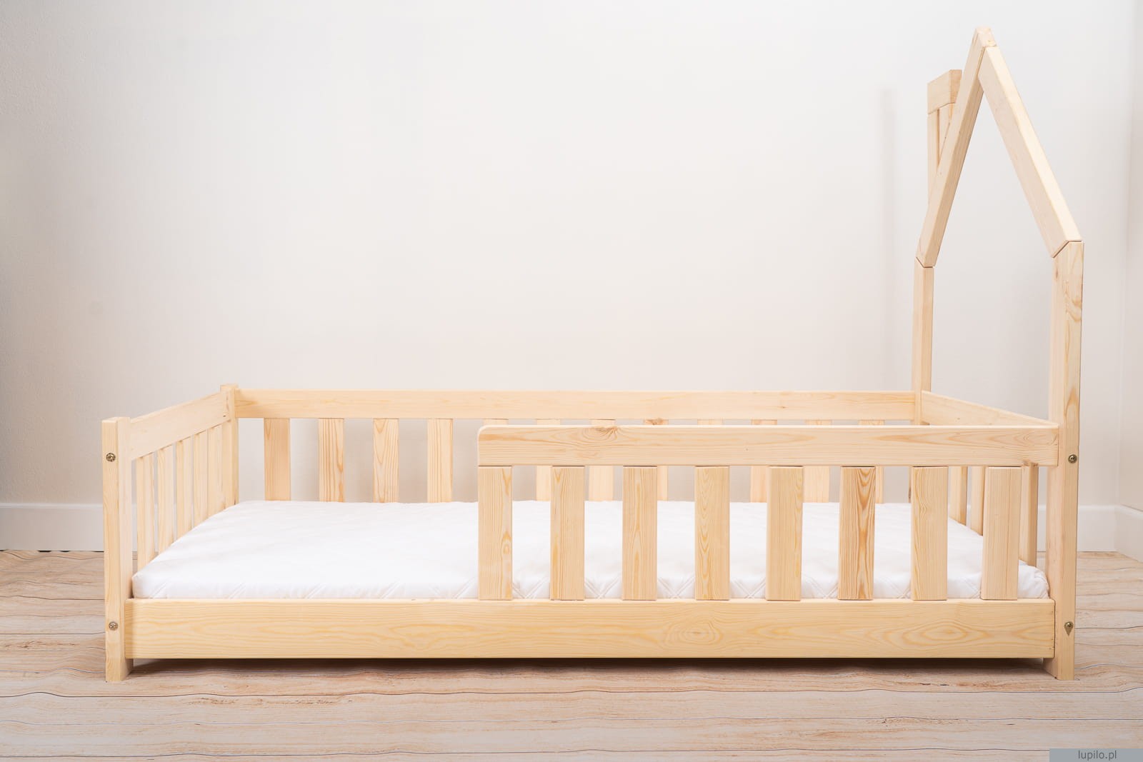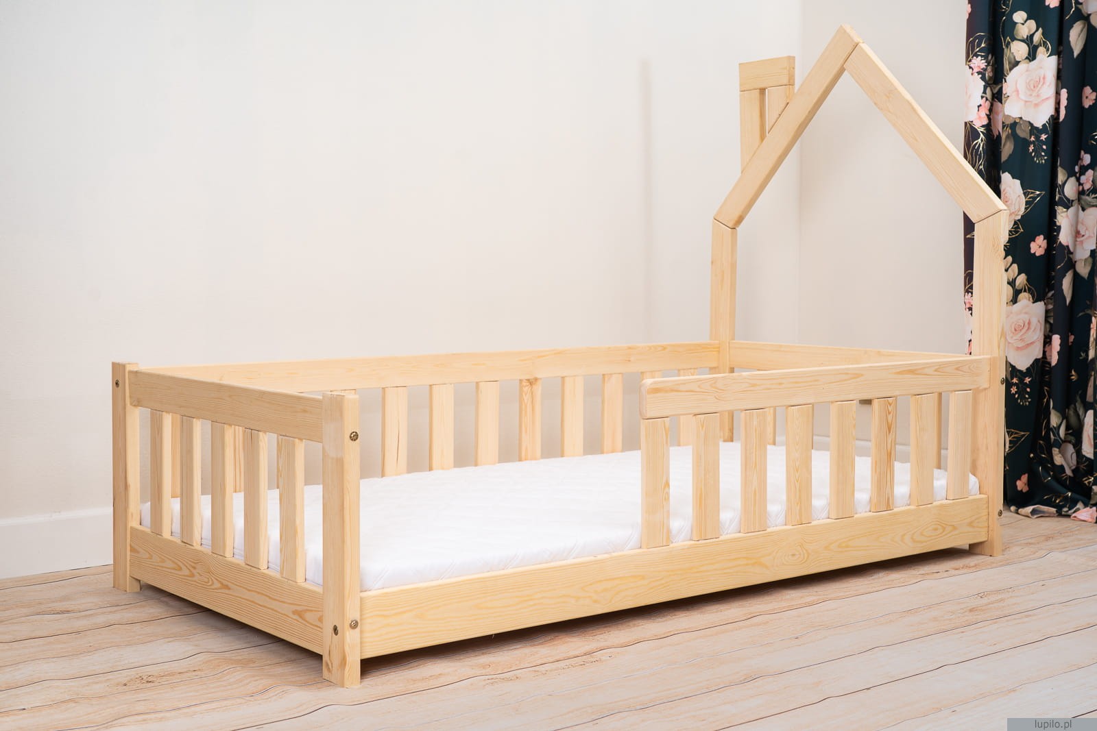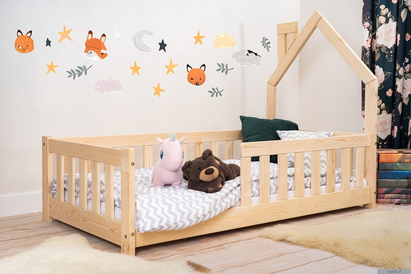 Łóżko dziecięce domek z kojec domek to świetna propozycja dla rodziców poszukujących połączenia estetyki, solidności i bezpieczeństwa. Łóżko o wymiarach 140x70cm posiada stabilną, wysoką konstrukcję w formie domku oraz elastyczny stelaż FLEX wykonany z brzozowych listew, które zapewniają odpowiednie podparcie dla materaca i zdrowy sen dziecka. Wysokogatunkowe drewno sosnowe, brak lakieru oraz starannie wygładzone krawędzie czynią mebel bezpiecznym oraz przyjaznym dla środowiska. Produkt przeznaczony jest do samodzielnego złożenia.